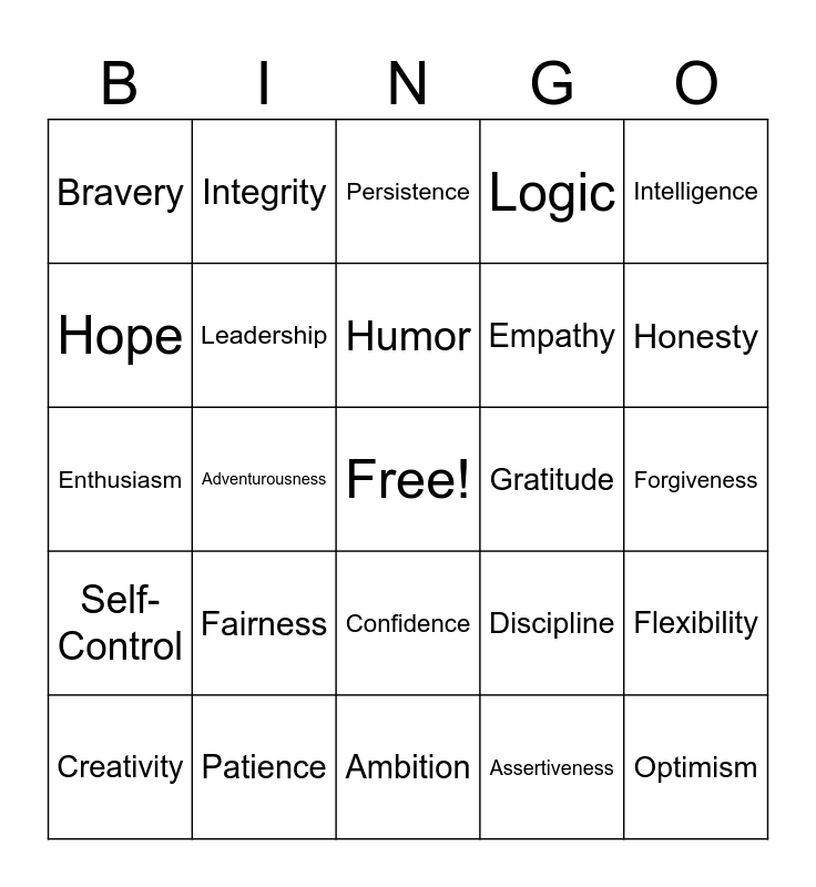 This bingo card has a free space and 36 words: Social awareness, Cooperation, Love of Learning, Leadership, Discipline, Self-Control, Humor, Modesty, Intelligence, Wisdom, Adventurousness, Logic, Kindness, Gratitude, Honesty, Bravery, Curiosity, Fairness, Optimism, Persistence, Forgiveness, Flexibility, Patience, Creativity, Ambition, Integrity, Enthusiasm, Responsibility, Empathy, Hope, Athleticism, Independence, Assertiveness, Confidence, Spirituality and Artistic Ability.