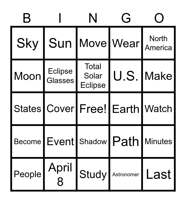 This bingo card has a free space and 24 words: Event, April 8, Total Solar Eclipse, People, North America, Sky, Moon, Sun, Earth, Shadow, U.S., States, Path, Minutes, Eclipse Glasses, Astronomer, Watch, Move, Make, Cover, Last, Become, Wear and Study.