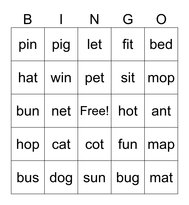 This bingo card has a free space and 24 words: cat, dog, pet, bus, bed, pin, hat, pig, hot, cot, sit, bun, fun, map, win, bug, ant, let, mop, net, mat, hop, fit and sun.