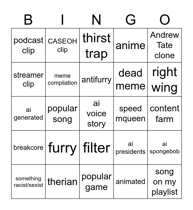 This bingo card has a free space and 24 words: furry, therian, antifurry, something racist/sexist, Andrew Tate clone, podcast clip, streamer clip, CASEOH clip, speed mqueen, filter, dead meme, ai generated, ai presidents, ai spongebob, meme compilation, animated, content farm, thirst trap, right wing, popular song, song on my playlist, breakcore, anime and popular game.