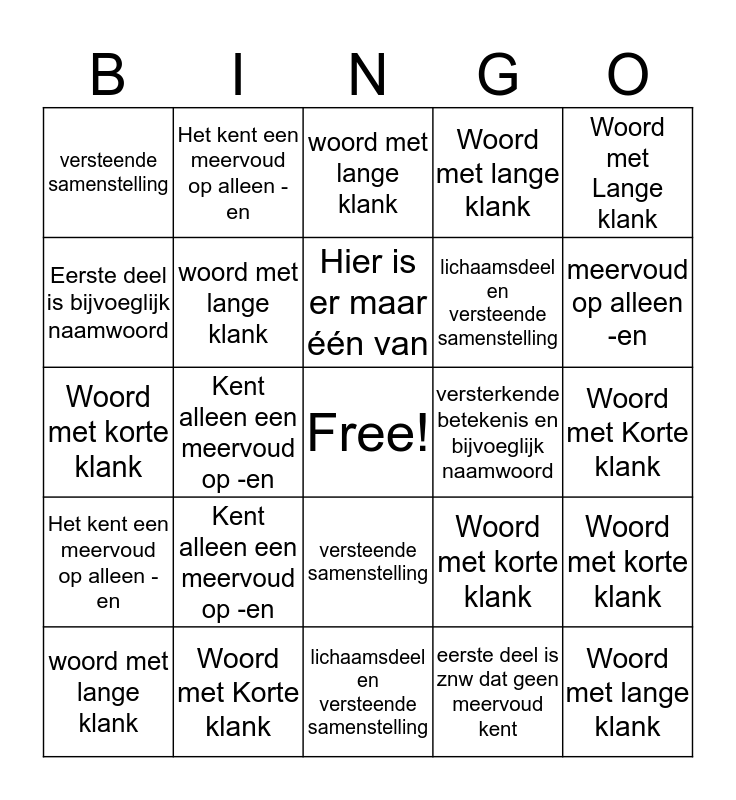 This bingo card has a free space and 29 words: woord met lange klank, woord met korte klank, Kent alleen een meervoud op -en, versterkende betekenis en bijvoeglijk naamwoord, versteende samenstelling, woord met lange klank, woord met lange klank, Kent alleen een meervoud op -en, versterkende betekenis en bijvoeglijk naamwoord, Woord met Korte klank, Woord met Korte klank, Woord met lange klank, lichaamsdeel en versteende samenstelling, eerste deel is znw dat geen meervoud kent, meervoud op alleen -en, Het kent een meervoud op alleen -en, versteende samenstelling, Het kent een meervoud op alleen -en, Woord met Lange klank, Woord met korte klank, Woord met korte klank, Woord met lange klank, lichaamsdeel en versteende samenstelling, Eerste deel is bijvoeglijk naamwoord, Woord met lange klank, Het kent een meervoud op alleen -en, Woord met korte klank, Hier is er maar één van and Woorden met een korte klank.