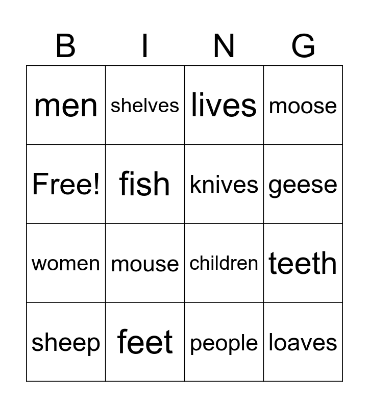 This bingo card has 16 words: feet, teeth, lives, men, women, shelves, children, people, Free!, fish, sheep, moose, mouse, geese, knives and loaves.