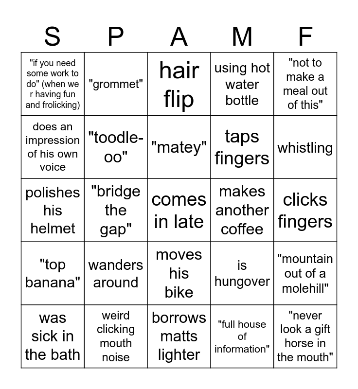 This bingo card has a free space and 32 words: "full house of information", "links in the chain", "bridge the gap", "love you and leave you", "top banana", "toodle-oo", "not to make a meal out of this", "mountain out of a molehill", "grommet", "MMMM", "matey", hair flip, "SPICY", watching the news with no headphones, makes another coffee, "what i can do for you is...", was sick in the bath, polishes his helmet, moves his bike, wanders around, is hungover, cheeky line, clicks fingers, weird clicking mouth noise, "never look a gift horse in the mouth", using hot water bottle, taps fingers, does an impression of his own voice, "if you need some work to do" (when we r having fun and frolicking), borrows matts lighter, asks for painkillers and whistling.