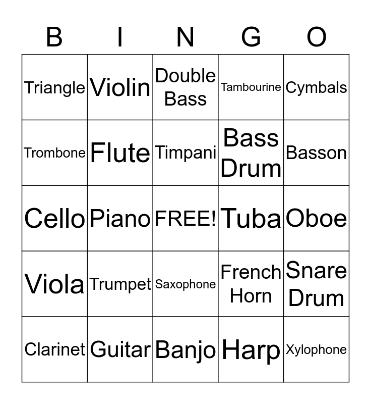 This bingo card has a free space and 24 words: Trumpet, Guitar, Timpani, Clarinet, Cymbals, Triangle, Trombone, Violin, Tuba, Saxophone, Bass Drum, Cello, French Horn, Snare Drum, Flute, Harp, Oboe, Double Bass, Basson, Piano, Xylophone, Viola, Tambourine and Banjo.