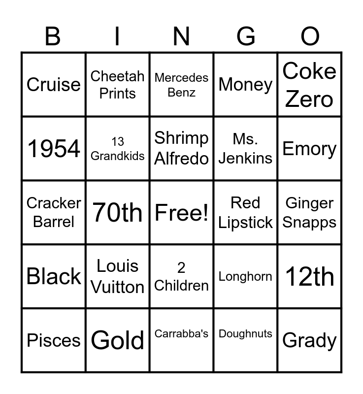 This bingo card has a free space and 24 words: Louis Vuitton, Gold, Shrimp Alfredo, Pisces, Coke Zero, Cruise, 1954, Cheetah Prints, Red Lipstick, 2 Children, Ms. Jenkins, Cracker Barrel, Longhorn, 12th, 13 Grandkids, Doughnuts, Ginger Snapps, Mercedes Benz, Emory, 70th, Grady, Black, Money and Carrabba's.