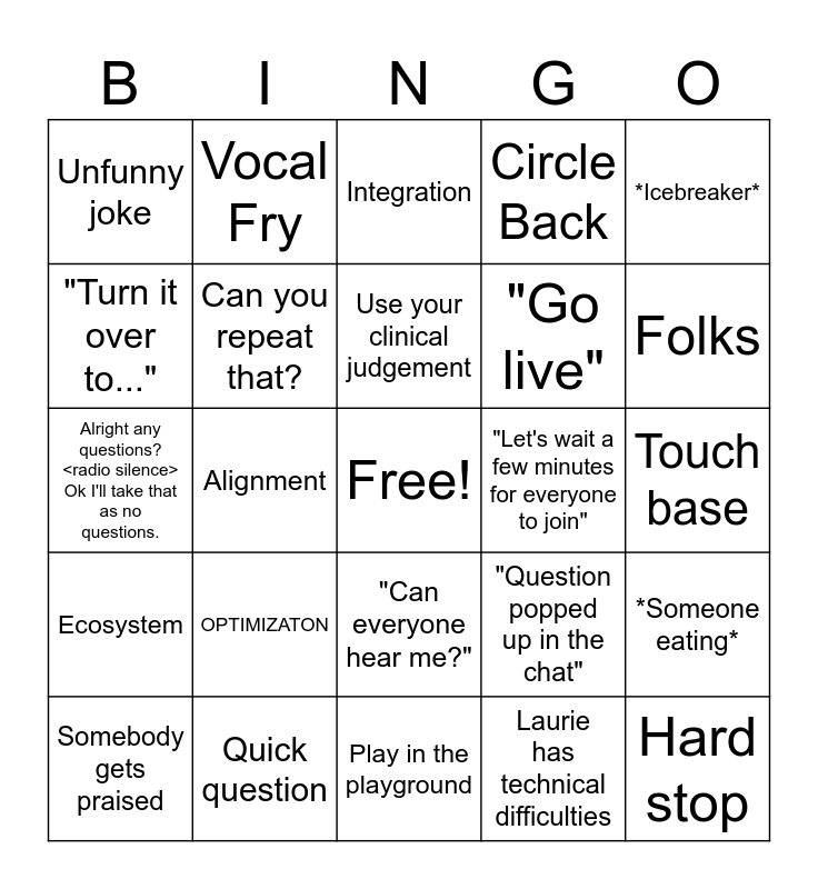 This bingo card has a free space and 24 words: OPTIMIZATON, Quick question, Use your clinical judgement, Somebody gets praised, *Icebreaker*, Unfunny joke, "Turn it over to...", Vocal Fry, "Let's wait a few minutes for everyone to join", "Can everyone hear me?", "Go live", Alright any questions? <radio silence> Ok I'll take that as no questions., "Question popped up in the chat", *Someone eating*, Can you repeat that?, Laurie has technical difficulties, Touch base, Integration, Folks, Alignment, Hard stop, Ecosystem, Circle Back and Play in the playground.