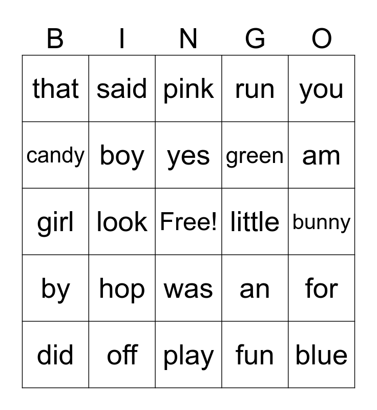 This bingo card has a free space and 24 words: hop, off, yes, did, you, that, candy, said, little, was, green, girl, an, for, boy, fun, bunny, pink, am, look, blue, by, run and play.