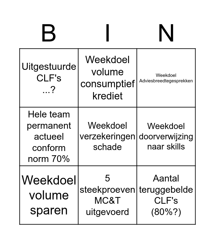 This bingo card has a free space and 8 words: Weekdoel doorverwijzing naar skills, Weekdoel Adviesbreedtegesprekken, Weekdoel volume consumptief krediet, Weekdoel volume sparen, Uitgestuurde CLF's ...?, Aantal teruggebelde CLF's (80%?), Hele team permanent actueel conform norm 70% and 5 steekproeven MC&T uitgevoerd.