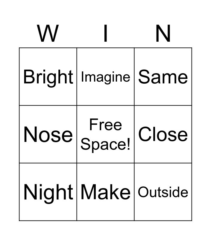 This bingo card has a free space and 8 words: Close, Same, Imagine, Night, Bright, Outside, Nose and Make.