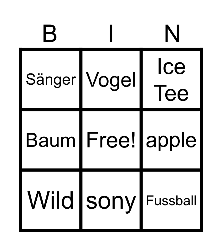 This bingo card has a free space and 8 words: apple, Ice Tee, Vogel, Wild, Sänger, Fussball, Baum and sony.