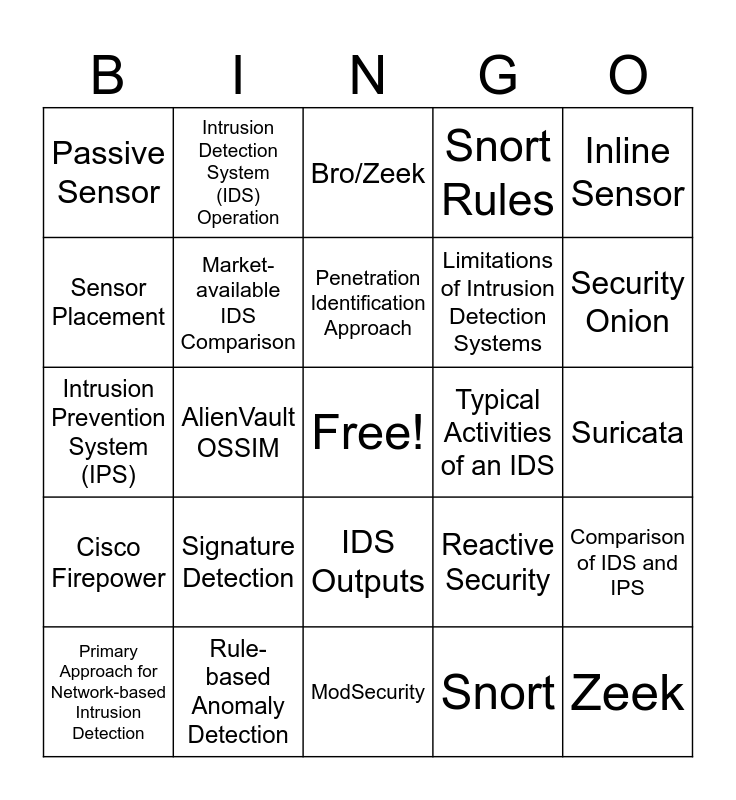 This bingo card has a free space and 24 words: Signature Detection, Rule-based Anomaly Detection, Penetration Identification Approach, Primary Approach for Network-based Intrusion Detection, Inline Sensor, Passive Sensor, Sensor Placement, Intrusion Detection System (IDS) Operation, Typical Activities of an IDS, IDS Outputs, Limitations of Intrusion Detection Systems, Intrusion Prevention System (IPS), Reactive Security, Comparison of IDS and IPS, Market-available IDS Comparison, Snort, Suricata, Bro/Zeek, Security Onion, AlienVault OSSIM, Zeek, Cisco Firepower, Snort Rules and ModSecurity.