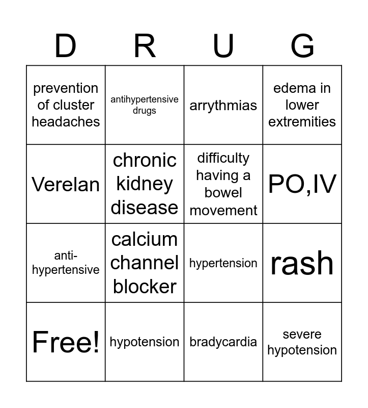 This bingo card has 23 words: severe hypotension, inhibits entry Ca+ ions, PO,IV, verapamil, Verelan, prevention of cluster headaches, chronic kidney disease, antihypertensive drugs, Free!, angina, calcium channel blocker, anti-hypertensive, headache, heartburn, hypotension, heart failure, arrythmias, hypertension, difficulty having a bowel movement, rash, edema in lower extremities, bradycardia and calan SR.