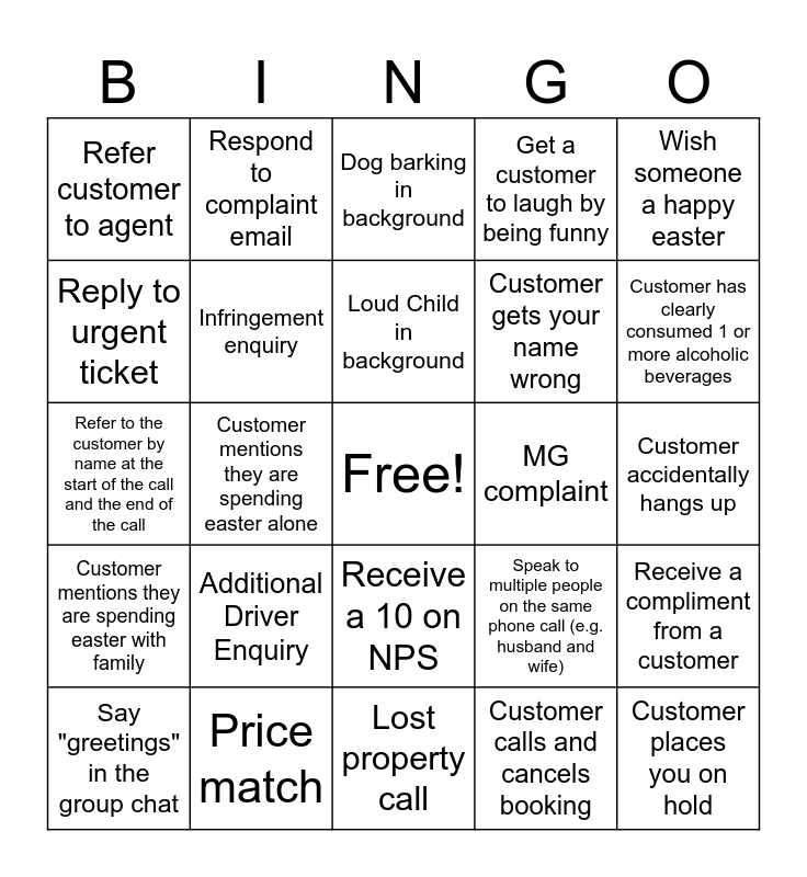 This bingo card has a free space and 24 words: Additional Driver Enquiry, Price match, Loud Child in background, Say "greetings" in the group chat, Wish someone a happy easter, Refer customer to agent, Reply to urgent ticket, Respond to complaint email, MG complaint, Receive a 10 on NPS, Customer gets your name wrong, Refer to the customer by name at the start of the call and the end of the call, Speak to multiple people on the same phone call (e.g. husband and wife), Receive a compliment from a customer, Infringement enquiry, Customer calls and cancels booking, Customer accidentally hangs up, Dog barking in background, Customer has clearly consumed 1 or more alcoholic beverages, Customer mentions they are spending easter alone, Customer places you on hold, Customer mentions they are spending easter with family, Get a customer to laugh by being funny and Lost property call.