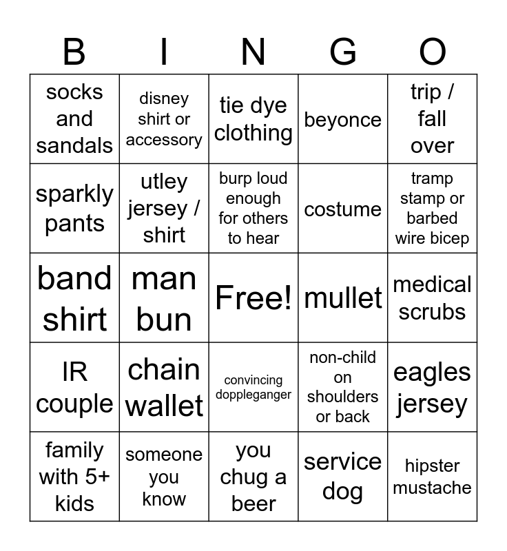 This bingo card has a free space and 29 words: family with 5+ kids, pink / blue / purple hair, man bun, domestic dispute, socks and sandals, tie dye clothing, utley jersey / shirt, chain wallet, mullet, someone you know, medical scrubs, hipster mustache, you chug a beer, service dog, tramp stamp or barbed wire bicep, leopard print clothing, convincing doppleganger, IR couple, trip / fall over, band shirt, non-child on shoulders or back, drop food or spill drink, costume, sparkly pants, beyonce, disney shirt or accessory, eagles jersey, burp loud enough for others to hear and nicki minaj.