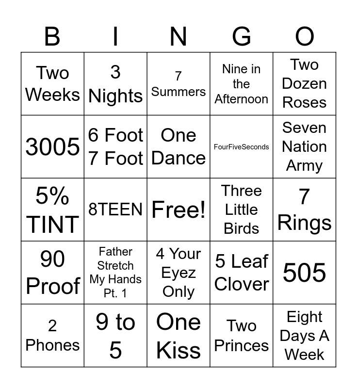 This bingo card has a free space and 25 words: Father Stretch My Hands Pt. 1, One Kiss, One Dance, 2 Phones, Two Dozen Roses, Two Weeks, 3005, 3 Nights, Three Little Birds, 4 Your Eyez Only, FourFiveSeconds, 5% TINT, 5 Leaf Clover, 505, 6 Foot 7 Foot, 679, 7 Rings, 7 Summers, Seven Nation Army, 8TEEN, Eight Days A Week, 9 to 5, 90 Proof, Nine in the Afternoon and Two Princes.