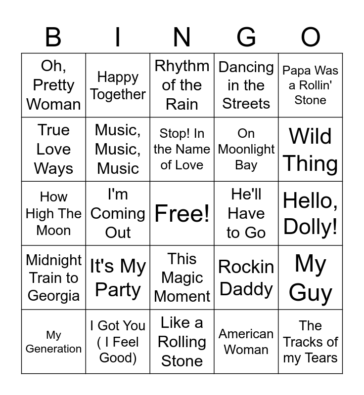 This bingo card has a free space and 56 words: Shake, Rattle and Roll, My Generation, Too Young, Oh, Pretty Woman, Like a Rolling Stone, Puppy Love, Music, Music, Music, Ain't That A Kick in the Head, On Moonlight Bay, Brown Eyed Girl, Dancing in the Streets, The Sound of Silence, I'll Never Love This Way Again, I'll Be There, I Only Have Eyes for You, Lonely Weekends, Papa Was a Rollin' Stone, I'm Coming Out, Beauty School Dropout, The Tracks of my Tears, He'll Have to Go, Can't Take My Eyes off You, Rockin Daddy, Rhythm of the Rain, I've Got a Woman, Stop! In the Name of Love, It's Too Late, Wanted, Wild Thing, Paint It, Black, C'Mon Everybody, Because Of You, I Wanna Hold Your Hand, Heartbreak Hotel, Hello, Dolly!, True Love Ways, How High The Moon, Cry, Midnight Train to Georgia, Happy Together, This Magic Moment, Ain't That a Shame, California Girls, Will You Love Me Tomorrow, Surf City, It's My Party, I Got You ( I Feel Good), Personality, Raindrops Keep Fallin’ On My Head, Running Bear, American Woman, Roses Are Red (My Love), (They Long to Be) Close to You, Simple Melody, My Guy and Tossin' and Turnin'.