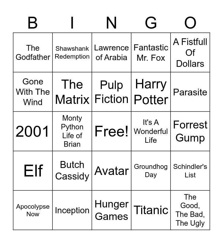 This bingo card has a free space and 24 words: Butch Cassidy, Inception, Pulp Fiction, Apocolypse Now, A Fistfull Of Dollars, The Godfather, Gone With The Wind, Shawshank Redemption, It's A Wonderful Life, Avatar, Harry Potter, 2001, Groundhog Day, Schindler's List, The Matrix, Titanic, Forrest Gump, Lawrence of Arabia, Parasite, Monty Python Life of Brian, The Good, The Bad, The Ugly, Elf, Fantastic Mr. Fox and Hunger Games.