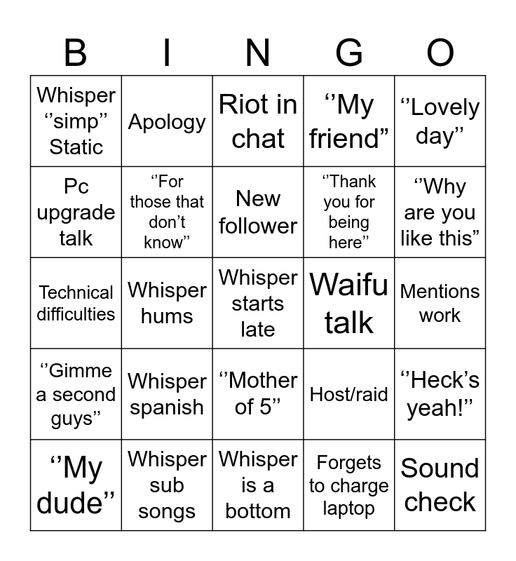 This bingo card has a free space and 24 words: Whisper spanish, Whisper sub songs, New follower, ‘’My dude’’, ‘’Lovely day’’, Whisper ‘’simp’’ Static, Pc upgrade talk, Apology, Waifu talk, ‘’Mother of 5’’, ‘’Thank you for being here’’, Technical difficulties, Host/raid, ‘’Heck’s yeah!’’, ‘’For those that don’t know’’, Forgets to charge laptop, Mentions work, Riot in chat, ‘’Why are you like this”, Whisper hums, Sound check, ‘’Gimme a second guys’’, ‘’My friend” and Whisper is a bottom.