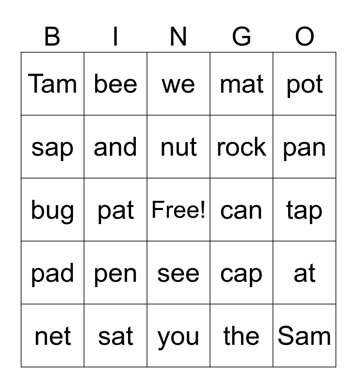 This bingo card has a free space and 30 words: sat, like, pat, Pam, Tam, we, and, see, can, you, tap, Sam, the, map, pan, ant, cap, pad, pen, pot, bug, ant, bee, rock, sap, mat, at, net, nut and cat.