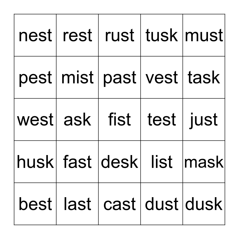 This bingo card has a free space and 24 words: fast, last, past, best, must, nest, pest, rest, test, desk, vest, west, list, mask, mist, dust, just, rust, task, ask, dusk, husk, tusk and cast.