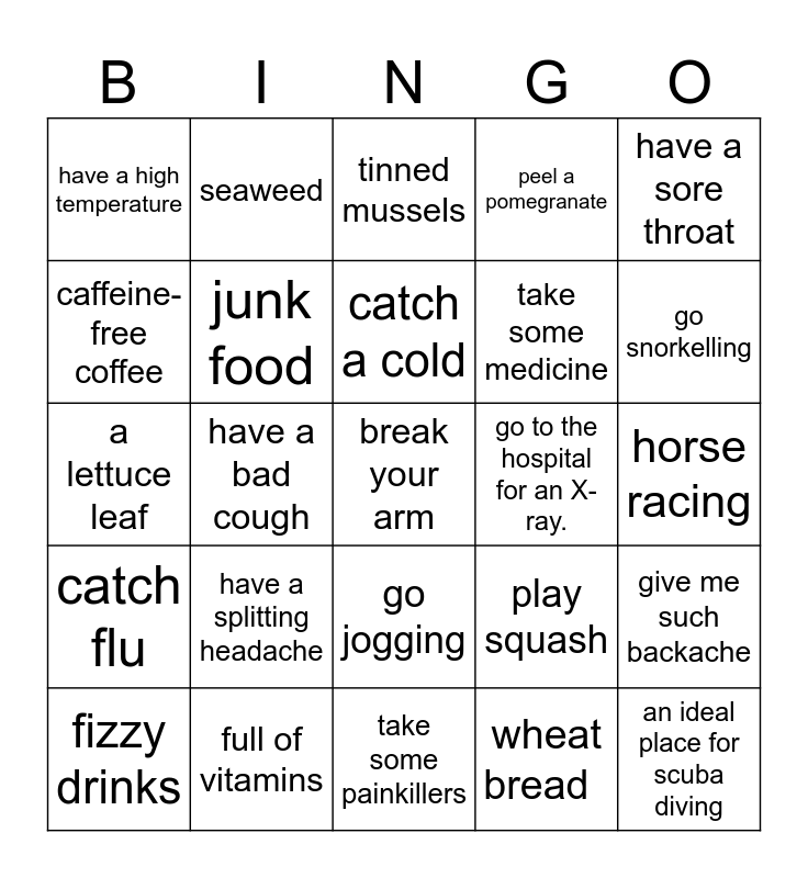 This bingo card has a free space and 24 words: have a splitting headache, full of vitamins, catch a cold, fizzy drinks, have a sore throat, have a high temperature, caffeine-free coffee, seaweed, go to the hospital for an X-ray., go jogging, take some medicine, a lettuce leaf, play squash, give me such backache, junk food, wheat bread, horse racing, tinned mussels, go snorkelling, have a bad cough, an ideal place for scuba diving, catch flu, peel a pomegranate and take some painkillers.