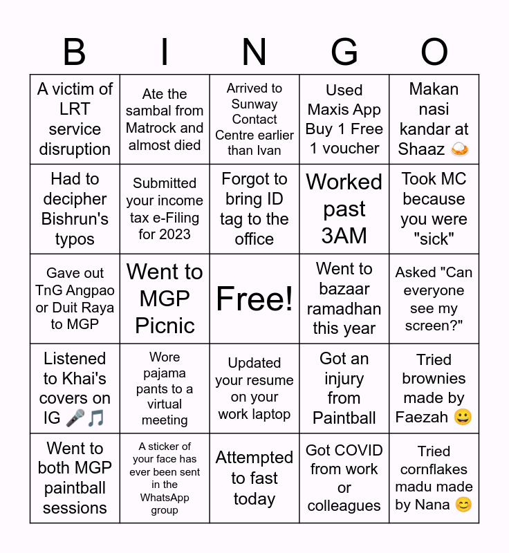 This bingo card has a free space and 24 words: Wore pajama pants to a virtual meeting, A sticker of your face has ever been sent in the WhatsApp group, Forgot to bring ID tag to the office, Went to both MGP paintball sessions, Makan nasi kandar at Shaaz 🍛, A victim of LRT service disruption, Had to decipher Bishrun's typos, Ate the sambal from Matrock and almost died, Went to bazaar ramadhan this year, Updated your resume on your work laptop, Worked past 3AM, Gave out TnG Angpao or Duit Raya to MGP, Got an injury from Paintball, Tried brownies made by Faezah 😀, Submitted your income tax e-Filing for 2023, Got COVID from work or colleagues, Asked "Can everyone see my screen?", Arrived to Sunway Contact Centre earlier than Ivan, Took MC because you were "sick", Went to MGP Picnic, Tried cornflakes madu made by Nana 😊, Listened to Khai's covers on IG 🎤🎵, Used Maxis App Buy 1 Free 1 voucher and Attempted to fast today.