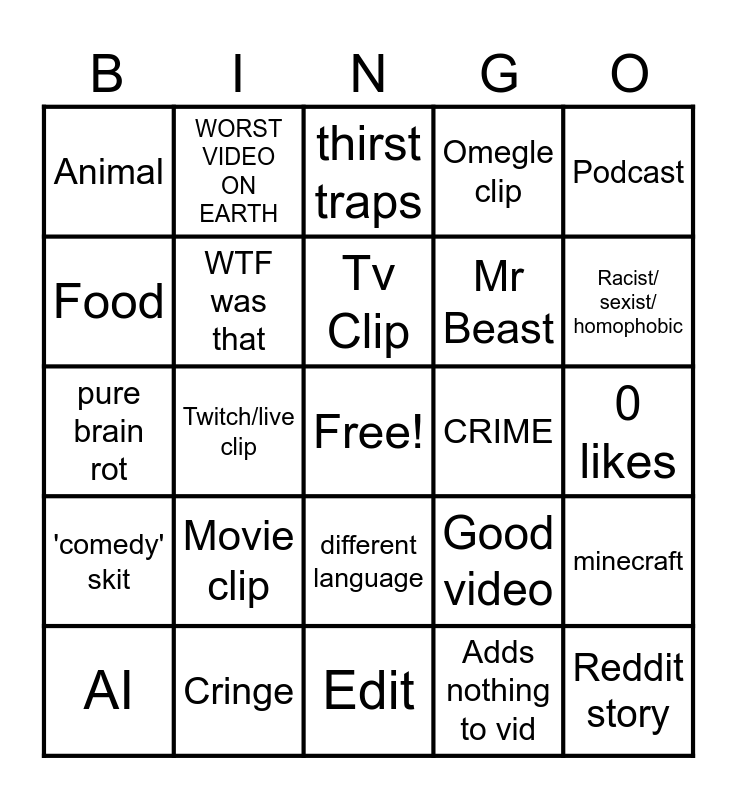 This bingo card has a free space and 24 words: AI, Movie clip, Tv Clip, Adds nothing to vid, Podcast, Animal, WORST VIDEO ON EARTH, thirst traps, CRIME, 0 likes, pure brain rot, WTF was that, Good video, minecraft, Food, Cringe, Edit, Omegle clip, Racist/ sexist/ homophobic, 'comedy' skit, Twitch/live clip, different language, Mr Beast and Reddit story.