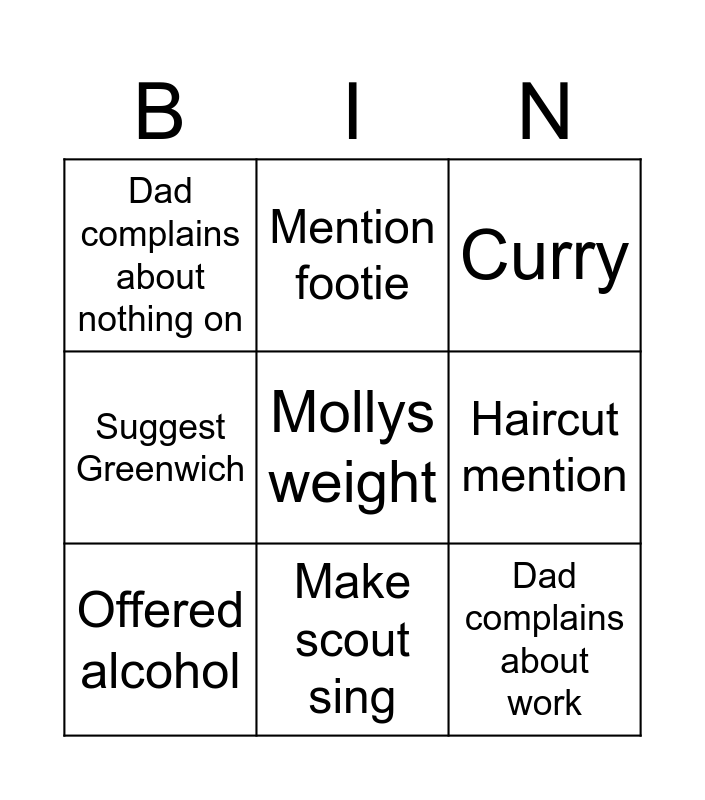 This bingo card has a free space and 8 words: Haircut mention, Curry, Mention footie, Offered alcohol, Dad complains about nothing on, Dad complains about work, Suggest Greenwich and Make scout sing.