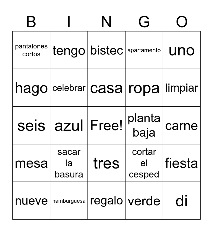 This bingo card has a free space and 52 words: hacer, di, ven, regalo, sacar la basura, limpiar, tengo, pongo, hago, dar una fiesta, celebrar, hacer la cama, fiesta, cortar el cesped, camiseta, cocina, casa, planta baja, si, uno, azul, verde, pantalones cortos, ropa, rojo, cien, pan, leer un libro, limpiar, baja, blanca, apartamento, ensalada, alto, madre, bistec, hamburguesa, papas fritas, sala, cuarto, escuela, carne, mesa, dos, tres, cinco, cocinar, seis, siete, ocho, nueve and diez.