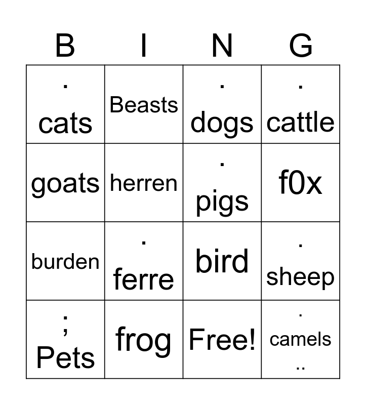 This bingo card has 17 words: Free!, ; Pets, · dogs, · cats, · ferre, · cattle, · sheep, · pigs, f0x, herren, frog, bird, goats, Beasts, burden, · horses and · camels ...