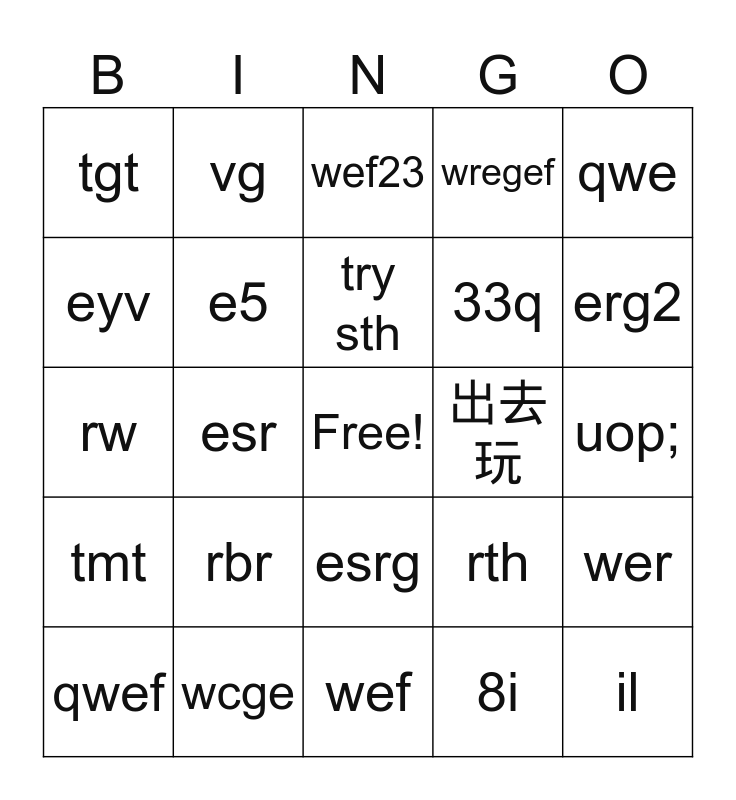 This bingo card has a free space and 24 words: rbr, wcge, try sth, qwef, qwe, tgt, eyv, vg, 出去玩, esrg, 33q, rw, rth, wer, e5, 8i, uop;, wef23, erg2, esr, il, tmt, wregef and wef.