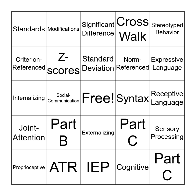 This bingo card has a free space and 32 words: Cognitive, Pragmatic, Social-Communication, Related Service, Joint-Attention, Z-scores, Stereotyped Behavior, Sensory Processing, Modifications, Adaptations, Standard Deviation, Significant Difference, PWN, Morphology, Syntax, Grammar, Proprioceptive, Internalizing, Externalizing, Part B, Part C, MLU, Receptive Language, ATR, Part C, Cross Walk, Norm-Referenced, Criterion-Referenced, Standards, IEP, Grammar and Expressive Language.