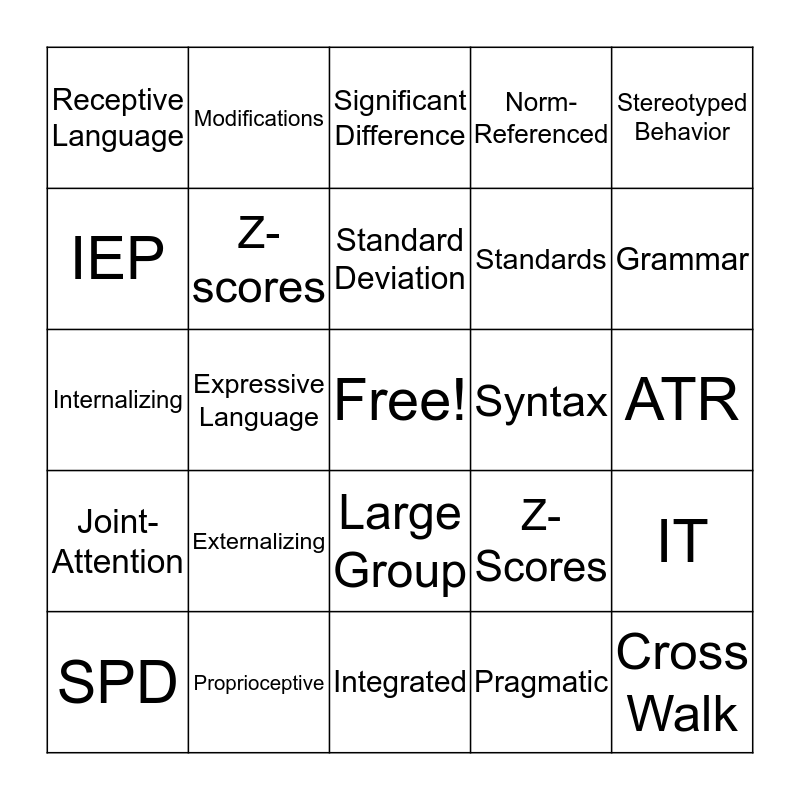 This bingo card has a free space and 34 words: Cognitive, Pragmatic, Social-Communication, Related Service, Joint-Attention, Z-scores, Stereotyped Behavior, SPD, Modifications, ASRS, Standard Deviation, Significant Difference, PWN, Morphology, Syntax, Grammar, Proprioceptive, Internalizing, Externalizing, Z-Scores, Large Group, MLU, Receptive Language, ATR, Integrated, Cross Walk, Norm-Referenced, Criterion-Referenced, Standards, IEP, Grammar, Expressive Language, IT and Large Group.