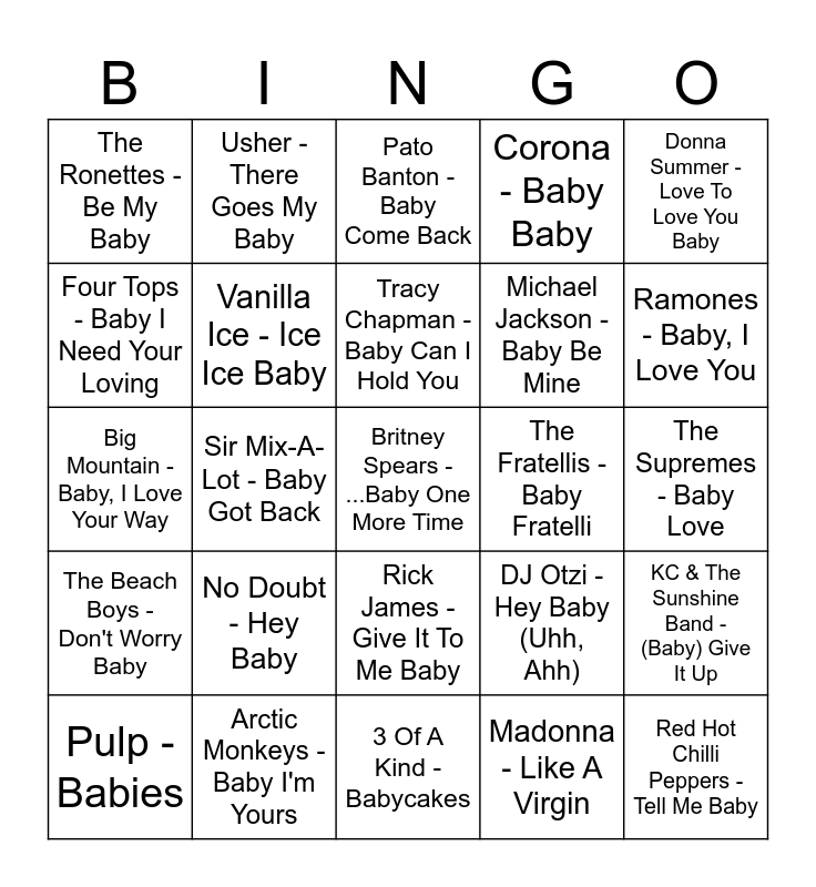 This bingo card has 30 words: Arctic Monkeys - Baby I'm Yours, Justin Bieber - Baby, Sir Mix-A-Lot - Baby Got Back, Beyonce - Baby Boy, The Ronettes - Be My Baby, Pato Banton - Baby Come Back, Vanilla Ice - Ice Ice Baby, Rick James - Give It To Me Baby, The Fratellis - Baby Fratelli, 3 Of A Kind - Babycakes, The Supremes - Baby Love, Britney Spears - ...Baby One More Time, Madonna - Like A Virgin, Red Hot Chilli Peppers - Tell Me Baby, Ramones - Baby, I Love You, Mariah Carey - Always Be My Baby, DJ Otzi - Hey Baby (Uhh, Ahh), The Beach Boys - Don't Worry Baby, No Doubt - Hey Baby, Donna Summer - Love To Love You Baby, Big Mountain - Baby, I Love Your Way, Muse - Plug In Baby, Usher - There Goes My Baby, Michael Jackson - Baby Be Mine, Four Tops - Baby I Need Your Loving, Corona - Baby Baby, KC & The Sunshine Band - (Baby) Give It Up, Pulp - Babies, Tracy Chapman - Baby Can I Hold You and Noisettes - Don't Upset The Rhythm (Go Baby Go).