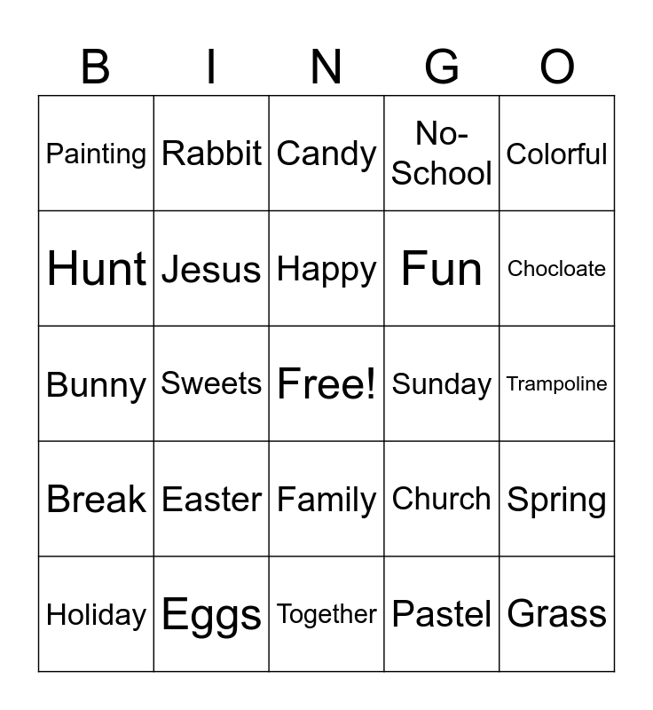 This bingo card has a free space and 24 words: Easter, Eggs, Happy, Holiday, Colorful, Painting, Hunt, Rabbit, Sunday, Family, Fun, Bunny, Church, Spring, Jesus, Pastel, Trampoline, Candy, Chocloate, Sweets, Grass, Break, No-School and Together.