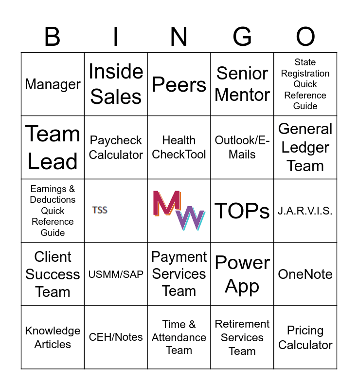 This bingo card has 1 images, a free space and 28 words: Knowledge Articles, Team Chat, Midwest 360, Manager, Peers, Paycheck Calculator, USMM/SAP, TOPs, CEH/Notes, J.A.R.V.I.S., Pricing Calculator, Time & Attendance Team, Retirement Services Team, General Ledger Team, Worker's Comp Team, Payment Services Team, Client Success Team, State Registration Quick Reference Guide, Earnings & Deductions Quick Reference Guide, Power App, RUN Support, Outlook/E-Mails, Team Lead, Senior Mentor, Inside Sales, OneNote, Health CheckTool and SMS/ISI.