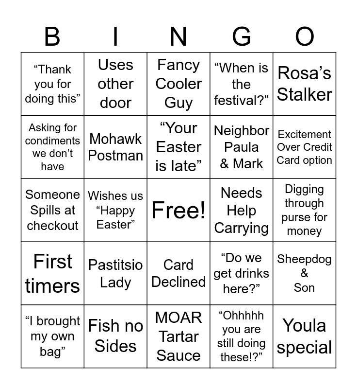 This bingo card has a free space and 24 words: Pastitsio Lady, Fish no Sides, “Your Easter is late”, “I brought my own bag”, Rosa’s Stalker, “Thank you for doing this”, Asking for condiments we don’t have, Uses other door, Needs Help Carrying, Card Declined, Neighbor Paula & Mark, Someone Spills at checkout, “Do we get drinks here?”, Sheepdog & Son, Mohawk Postman, “Ohhhhh you are still doing these!?”, Digging through purse for money, Fancy Cooler Guy, Excitement Over Credit Card option, Wishes us “Happy Easter”, Youla special, First timers, “When is the festival?” and MOAR Tartar Sauce.