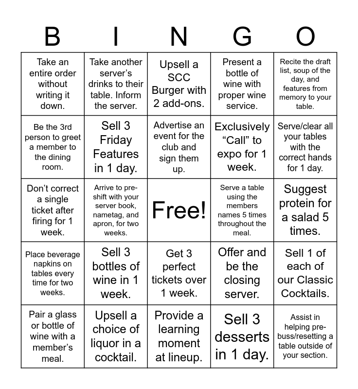 This bingo card has a free space and 24 words: Sell 3 bottles of wine in 1 week., Upsell a choice of liquor in a cocktail., Advertise an event for the club and sign them up., Pair a glass or bottle of wine with a member’s meal., Recite the draft list, soup of the day, and features from memory to your table., Take an entire order without writing it down., Be the 3rd person to greet a member to the dining room., Take another server’s drinks to their table. Inform the server., Serve a table using the members names 5 times throughout the meal., Get 3 perfect tickets over 1 week., Exclusively “Call” to expo for 1 week., Don’t correct a single ticket after firing for 1 week., Offer and be the closing server., Sell 1 of each of our Classic Cocktails., Sell 3 Friday Features in 1 day., Sell 3 desserts in 1 day., Suggest protein for a salad 5 times., Upsell a SCC Burger with 2 add-ons., Serve/clear all your tables with the correct hands for 1 day., Arrive to pre-shift with your server book, nametag, and apron, for two weeks., Assist in helping pre-buss/resetting a table outside of your section., Place beverage napkins on tables every time for two weeks., Present a bottle of wine with proper wine service. and Provide a learning moment at lineup..