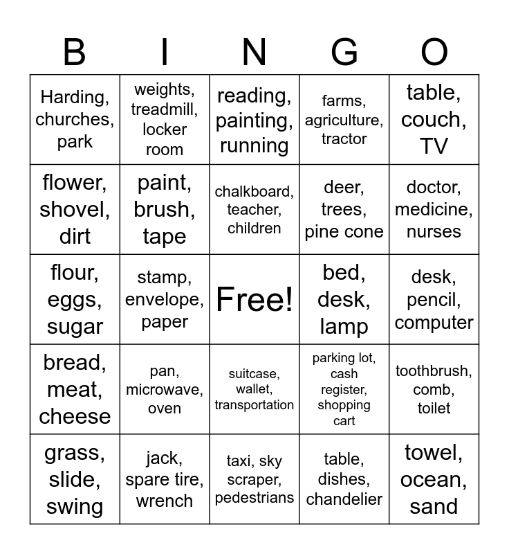 This bingo card has a free space and 24 words: pan, microwave, oven, jack, spare tire, wrench, chalkboard, teacher, children, grass, slide, swing, table, couch, TV, Harding, churches, park, flower, shovel, dirt, weights, treadmill, locker room, bed, desk, lamp, suitcase, wallet, transportation, deer, trees, pine cone, flour, eggs, sugar, parking lot, cash register, shopping cart, toothbrush, comb, toilet, paint, brush, tape, table, dishes, chandelier, desk, pencil, computer, reading, painting, running, doctor, medicine, nurses, stamp, envelope, paper, towel, ocean, sand, bread, meat, cheese, farms, agriculture, tractor and taxi, sky scraper, pedestrians.