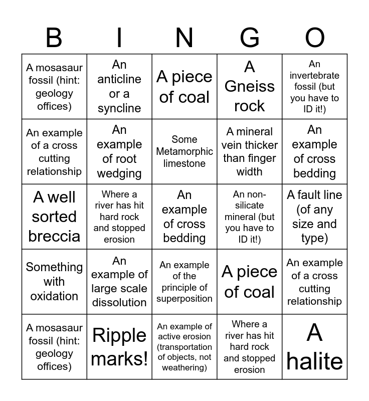 This bingo card has 41 words: Free!, A well sorted breccia, Find me some SiO2, An example of root wedging, Ripple marks!, An example of the principle of superposition, Some Metamorphic limestone, An intrusive igneous Rock larger than your hand, An invertebrate fossil (but you have to ID it!), Something with oxidation, Where a river has hit hard rock and stopped erosion, A Gneiss rock, An example of cross bedding, A fault line (of any size and type), An non-silicate mineral (but you have to ID it!), An example of large scale dissolution, An anticline or a syncline, A mosasaur fossil (hint: geology offices), A cutbank, A piece of coal, An example of a cross cutting relationship, A halite, An example of active erosion (transportation of objects, not weathering), A mineral vein thicker than finger width, An example of biochemical perception before lithification, R, Where a river has hit hard rock and stopped erosion, A Gneiss rock, An example of cross bedding, A fault line (of any size and type), An example of large scale dissolution, An anticline or a syncline, A mosasaur fossil (hint: geology offices), A cutbank, A piece of coal, An example of a cross cutting relationship, A halite, An example of active erosion (transportation of objects, not weathering), A mineral vein thicker than finger width, An example of biochemical perception before lithification and A geologist (other than your professor or TA).