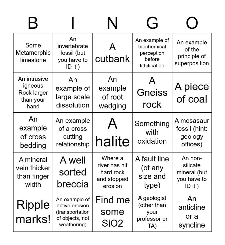 This bingo card has 25 words: A well sorted breccia, Find me some SiO2, An example of root wedging, Ripple marks!, An example of the principle of superposition, Some Metamorphic limestone, An intrusive igneous Rock larger than your hand, An invertebrate fossil (but you have to ID it!), Something with oxidation, Where a river has hit hard rock and stopped erosion, A Gneiss rock, An example of cross bedding, A fault line (of any size and type), An non-silicate mineral (but you have to ID it!), An example of large scale dissolution, An anticline or a syncline, A mosasaur fossil (hint: geology offices), A cutbank, A piece of coal, An example of a cross cutting relationship, A halite, An example of active erosion (transportation of objects, not weathering), A mineral vein thicker than finger width, An example of biochemical perception before lithification and A geologist (other than your professor or TA).
