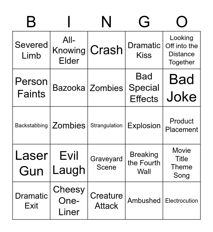 This bingo card has 28 words: Movie Title Theme Song, Starting an Impossible Journey, Bad Special Effects, Ambushed, Person Faints, Crash, All-Knowing Elder, Laser Gun, Explosion, Dramatic Exit, Backstabbing, Dramatic Kiss, Cheesy One-Liner, Creature Attack, Bad Joke, Person Held Hostage, Evil Laugh, Bazooka, Zombies, Graveyard Scene, Severed Limb, Electrocution, Strangulation, Zombies, Product Placement, Breaking the Fourth Wall, Looking Off into the Distance Together and Speech About the Faults of Man.