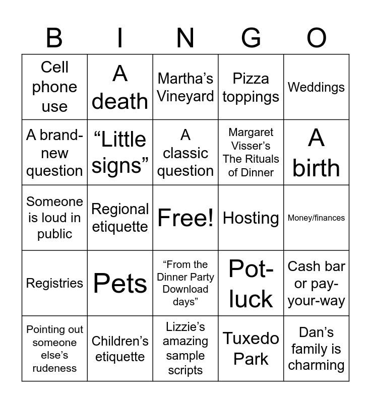 This bingo card has a free space and 44 words: Consideration, Respect, and Honesty, Dan’s family is charming, Table manners, Pointing out someone else’s rudeness, Thank you cards, Tuxedo Park, Martha’s Vineyard, Something unbelievably Vermont™, Weddings, Children’s etiquette, Pizza toppings, Hosting, “From the Dinner Party Download days”, Pets, Dan’s mysterious past as a dancer, Lizzie’s amazing sample scripts, Gifting, Someone is loud in public, Holding doors or chairs, A birth, A death, Graduations, Business etiquette, Cell phone use, Alliterative sign-offs, Money/finances, A fake name is YOUR name, Train the trainer program, Pot-luck, Registries, Pop culture reference, Cash bar or pay-your-way, Allergies, Finger bowls, Regional etiquette, Generational differences, Invitations, Cars and driving, A classic question, A brand-new question, Margaret Visser’s The Rituals of Dinner, Settle an argument, “Little signs” and Dress codes.