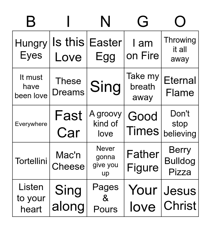 This bingo card has 76 words: Free!, Eggs, Easter Egg, Bunny, Chick, Lent, Easter Sunday, Good Friday, Ash Wednesday, Egg Hunt, Jesus Christ, He is Risen, Sing, It must have been love, Up where we belong, Fast Car, Broken wings, A groovy kind of love, Nothings is going to stop us now, Throwing it all away, Every breath you take, Everywhere, These Dreams, Is this Love, I am on Fire, Red Red Wine, In the air tonight, Maneater, Purple Rain, Up where we belong, She's like the wind, Rosanna, Lady in Red, Father Figure, Eternal Flame, Take my breath away, Time after time, Careless whisper, Don't stop believing, Your love, Love Shack, Do you really want to hurt me, I will always love you, Time of my life, Manic Monday, Holding out for a Hero, Listen to your heart, Hungry Eyes, Girls just want to have fun, Summer of 69, Wanted dead or alive, Never gonna give you up, Crazy, Wine, Bronze, Red, Rose, Pizza, Bruschetta, Taco, Mac'n Cheese, Muscadine, Acai, Mango, Pomegranate, Relax, Good Times, Great Company, Shrimp, Brisket, Berry Bulldog Pizza, Tortellini, Sing along, Karaoke, Pages & Pours and Hidden.