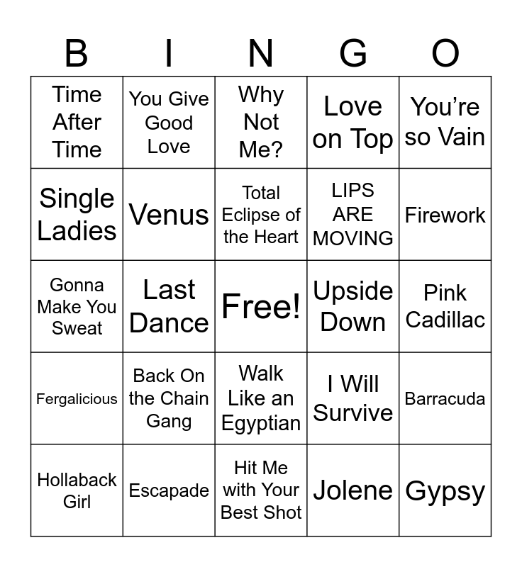 This bingo card has a free space and 35 words: Side to Side, Think, Ring My Bell, Venus, Walk Like an Egyptian, Love on Top, Single Ladies, Ain’t Nobody, Total Eclipse of the Heart, Oops!.. I Did It Again, Gonna Make You Sweat, You’re so Vain, Sin Wagon, Realize, Time After Time, Upside Down, Jolene, Last Dance, Fergalicious, Gypsy, I Will Survive, Hollaback Girl, Barracuda, Escapade, Why Not Me?, Firework, Bette Davis Eyes, You’re No Good, LIPS ARE MOVING, Pink Cadillac, So What ?, Hit Me with Your Best Shot, Back On the Chain Gang, You Give Good Love and Call me.