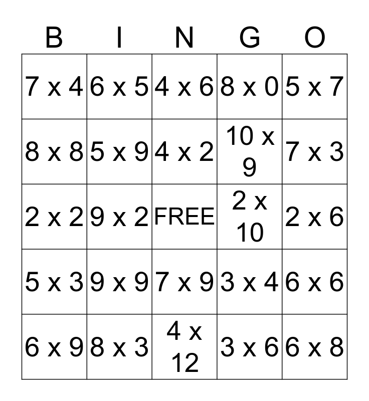 This bingo card has a free space and 24 words: 9 x 9, 8 x 3, 4 x 2, 6 x 9, 5 x 7, 7 x 4, 8 x 8, 6 x 5, 2 x 10, 7 x 9, 10 x 9, 2 x 2, 3 x 4, 6 x 6, 5 x 9, 3 x 6, 2 x 6, 4 x 6, 7 x 3, 9 x 2, 6 x 8, 5 x 3, 8 x 0 and 4 x 12.