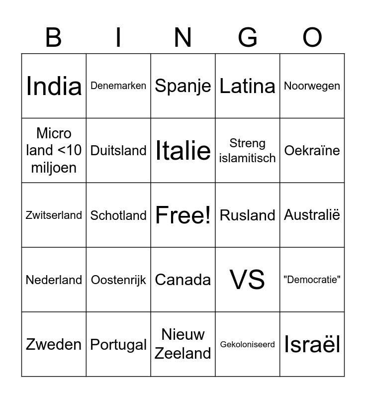 This bingo card has 1 images, a free space and 33 words: Engeland Schotland Ierland Nederland Duitsland Noorwegen Zweden Denemarken Frankrijk Italie Spanje België Tsjech Rusland Oekraïne Portugal Zwitserland Oostenrijk VS Canada Zuid-Afrika India Australië Nieuw Ze, Engeland, Schotland, Ierland, Nederland, Duitsland, Noorwegen, Zweden, Denemarken, Frankrijk, Italie, Spanje, België, Tsjech, Rusland, Oekraïne, Portugal, Zwitserland, Oostenrijk, VS, Canada, Zuid-Afrika, India, Australië, Nieuw Zeeland, Israël, Latina, Streng islamitisch, Micro land <10 miljoen, "Democratie", Landlocked land, Gekoloniseerd and Het land Afrika.