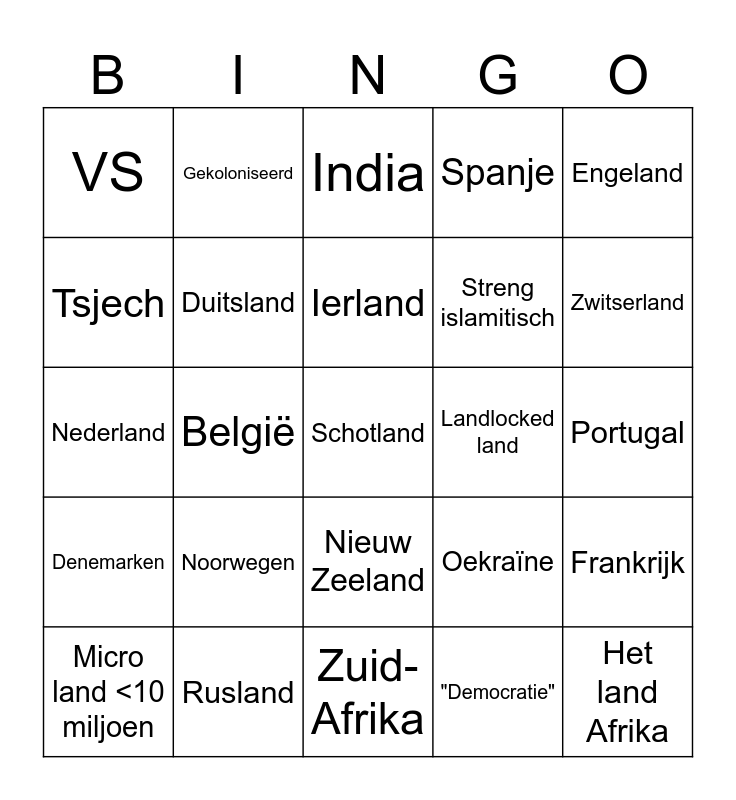This bingo card has 32 words: "Democratie", Australië, België, Canada, Denemarken, Duitsland, Engeland, Frankrijk, Gekoloniseerd, Het land Afrika, Ierland, India, Israël, Italie, Landlocked land, Latina, Micro land <10 miljoen, Nederland, Nieuw Zeeland, Noorwegen, Oekraïne, Oostenrijk, Portugal, Rusland, Schotland, Spanje, Streng islamitisch, Tsjech, VS, Zuid-Afrika, Zweden and Zwitserland.