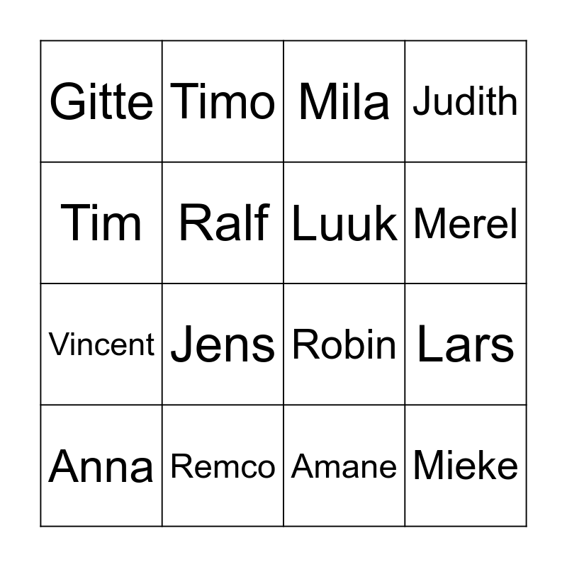 This bingo card has 17 words: Amane, Anna, Mila, Gitte, Jens, Judith, Lars, Luuk, Merel, Ralf, Remco, Robin, Tim, Timo, Vincent, Vera and Mieke.