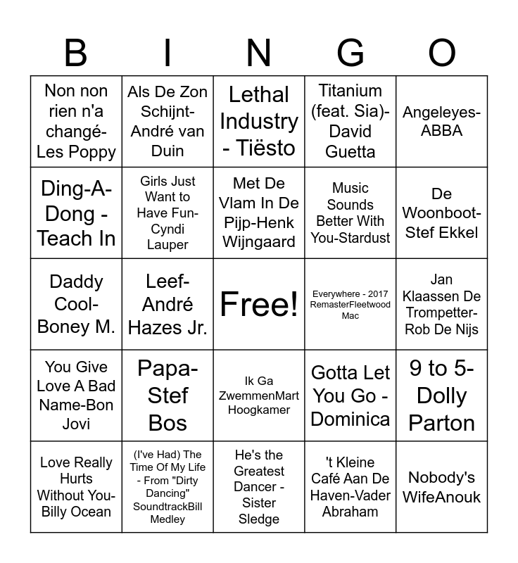 This bingo card has a free space and 39 words: 't Dondert En ’t Bliksemt-Guus Meeuwis, Holding Out for a Hero - Bonnie Tyler, Ma Baker-Boney M., Girls Just Want to Have Fun-Cyndi Lauper, Love Really Hurts Without You-Billy Ocean, Ik Ga ZwemmenMart Hoogkamer, Met De Vlam In De Pijp-Henk Wijngaard, Hotel California - 2013 RemasterEagles, Angeleyes- ABBA, You Give Love A Bad Name-Bon Jovi, Leef-André Hazes Jr., Titanium (feat. Sia)-David Guetta, Nobody's WifeAnouk, Jan Klaassen De Trompetter-Rob De Nijs, Everywhere - 2017 RemasterFleetwood Mac, Papa-Stef Bos, Foxie Foxtrot -Nico Haak, Non non rien n'a changé-Les Poppy, Rio - Maywood, Gotta Let You Go - Dominica, Ding-A-Dong -Teach In, He's the Greatest Dancer - Sister Sledge, Music Sounds Better With You-Stardust, De Woonboot-Stef Ekkel, 2 Times- Ann Lee, Ons Moeder Zeej Nog-Jan Biggel, Happiness-Alexis Jordan, Uit M’n Bol-Andre Hazes, Amalia-Wesly Bronkhorst, Als De Zon Schijnt-André van Duin, Papa-Stef Bos, King of My Castle (Roy Malone's King Radio Edit)-Wamdue Project, Lethal Industry - Tiësto, (I've Had) The Time Of My Life - From "Dirty Dancing" SoundtrackBill Medley, 't Kleine Café Aan De Haven-Vader Abraham, Hypnotized - Purple Disco Machine, 9 to 5-Dolly Parton, Daddy Cool-Boney M. and Als De Morgen Is Gekomen-Jan Smit.